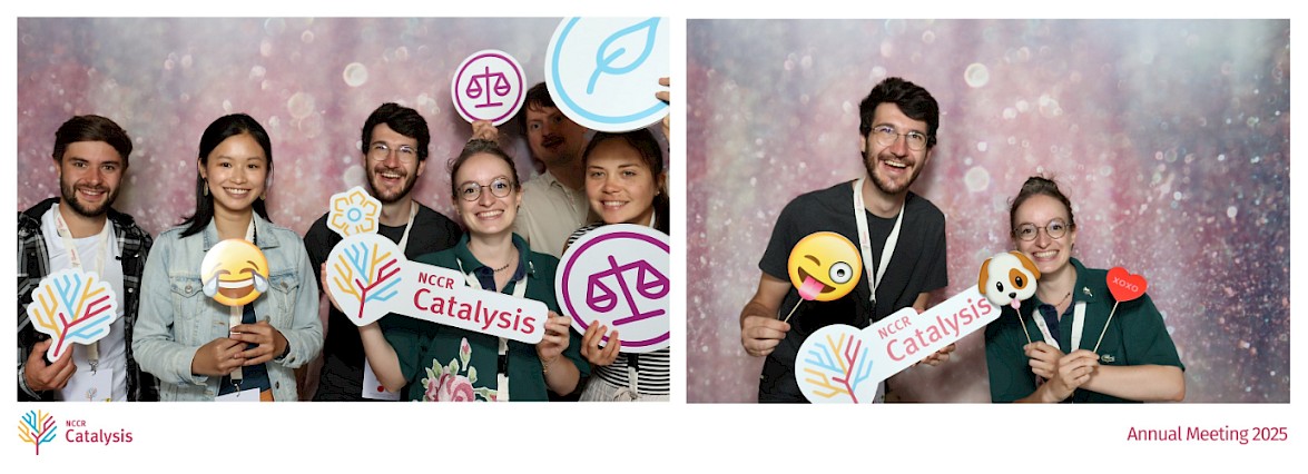 Adriana and Nicolas with NCCR Catalysis colleagues from the Buller and Benin groups at the photo booth at the NCCR Catalysis Annal Meeting 2025.